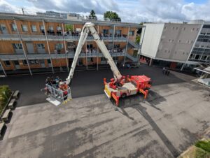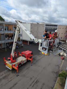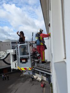 Le déploiement du bras élévateur a permis une évacuation des élèves en douceur. Mais certains ont tout de même dû vaincre le vertige afin de grimper dans la nacelle, assistés des pompiers. Bravo à tous !