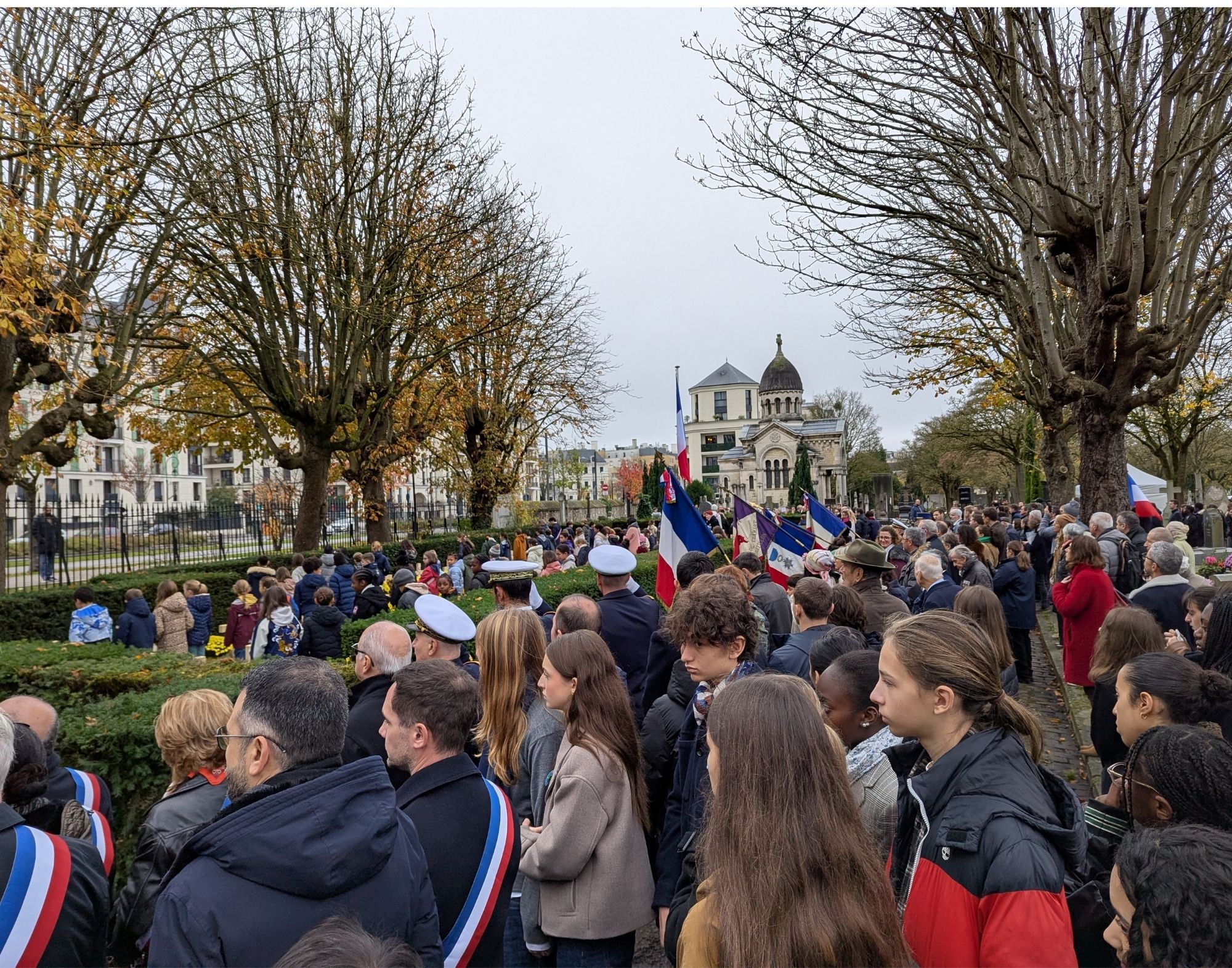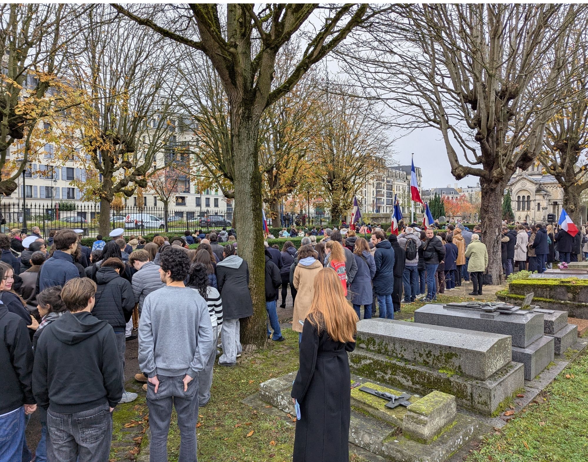 Près de 70 élèves des classes de TG04, 1G10, 1G11, 1G04 et 1G08 ont assisté à la commémoration du 11 novembre au cimetière du Bois Tardieu, devant le monument aux morts, en présence notamment du député M. Berger et du maire M. Coscas, ainsi que du président du Souvenir français de Clamart, M. Philipp. Etaient également présentes plusieurs autorités militaires, ainsi que le directeur de l’hôpital militaire de Percy et le commissaire de police de Clamart. La cérémonie fut digne et émouvante, avec des lectures par des élèves de primaire et du collège de poèmes et de lettres de poilus. Un hommage a été rendu à tous les soldats morts pour la France puis, après l’hymne national, des jeunes gens ont déposé des fleurs sur les tombes des soldats clamartois. A l’issue de la cérémonie, nous avons pu échanger avec des anciens combattants, et certains élèves, visiblement émus, se sont spontanément portés volontaires pour devenir porte-drapeaux.